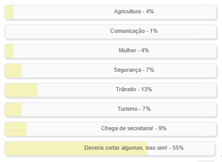 “Que secretaria o prefeito de Campo Mourão, Douglas Fabrício, deveria criar?” Enquete encerradas neste domingo deu vitória à alternativa “Deveria cortar algumas, isso sim!”, com 55% dos votos. A opção “Trânsito” teve 13%, seguida de “Chega de secretaria!”, com 9%. “Segurança” e “Turismo” tiveram 7% cada. O resultado completo está no quadro acima.