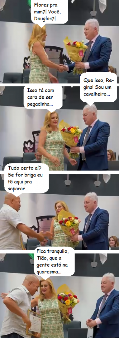 Douglas Fabrício, prefeito de Campo Mourão, ao discursar na sessão solene da Câmara que entregou o Prêmio Mulher Cidadã a 12 mulheres, uma delas a ex-primeira-dama Hosana Tezelli, que estava acompanhado do marido, o ex-prefeito (por 16 anos!) Tauillo Tezelli; sexta-feira. Em tempo: Hosana também discursou, em nome das homenageadas.