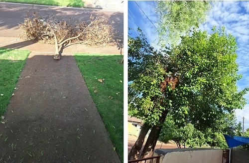 Rua São José, abaixo da perimetral. Faz um mês, protocolo aberto na prefeitura para retirada do galho. E tem das árvores também, que estão para cair...