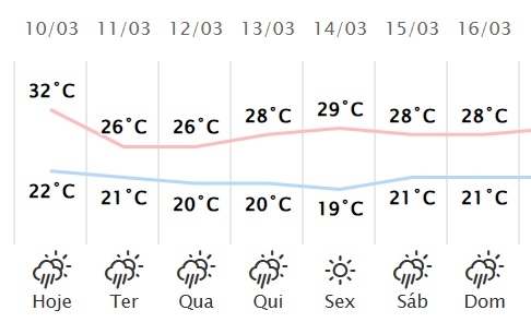 A semana começa quente em Campo Mourão, com a temperatura máxima chegando a 32 graus, mas cai a partir de terça-feira. Pelo menos é o que prevê o Simepar. A máxima não passa dos 26 graus na terça, quando deve chover 14 mm. Também fica nos 26 graus na quarta e vai até o fim de semana oscilando entre as máximas de 28 e 29 graus. Somente para sexta-feira não haverá pancadas de chuvas.