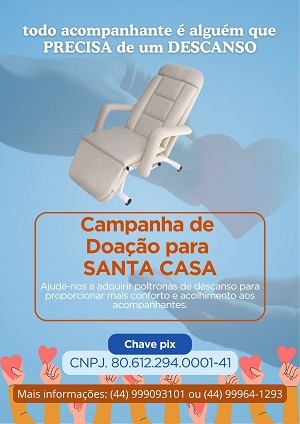 Dos 156 leitos da Santa Casa de Campo Mourão, apenas 25 contam com cadeira de descanso adequada para acompanhantes. Nos demais, são cadeiras comuns. Para tentar mudar essa realidade, foi iniciada uma campanha de arrecadação. Cada cadeira custa R$ 840, mas é possível ajudar com qualquer valor através do Pix (veja chave acima).