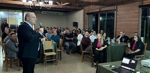 Fábio D’Alécio, prefeito de Ubiratã e presidente do Condescom, sobre o trabalho da Comcam, do Cis-Comcam e do próprio Condescom; durante assembleia do Cis-Comcam, em Campo Mourão, com a participação do secretário de Estado da Saúde, Beto Preto, sexta-feira.