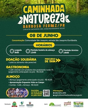 Acontece no próximo domingo (8h) a Caminhada Internacional na Natureza em Barbosa Ferraz.