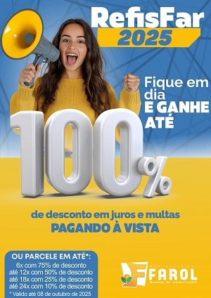 Farol – Contribuinte com impostos municipais em atraso pode aderir ao Refisfar. Pagando à vista, ganha desconto de 100% nos juros e multas, mas é possível parcelar em até 24 vezes com desconto menores.