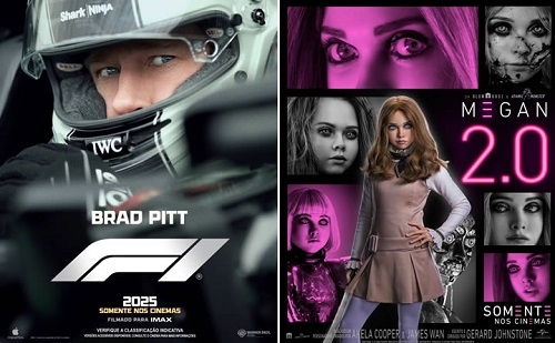 Duas estreias esta semana no Cinemaxs, em Campo Mourão. Uma delas é “F1”, com Brad Pitt no mundo na Fórmula 1, com sessões às 21h40. A outra é o terror “Megan 2.0”, às 19h15 (de quinta a sábado também às 21h45). Seguem em exibição “Como treinar o seu dragão” (15h30 e 19h), “Lilo e Stitch” (16h e 19h15) e “Elio” (16h).