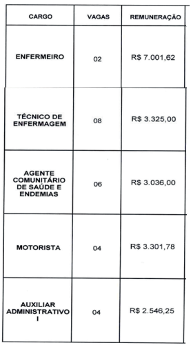 Anote lá: enfermeiro (2 vagas), técnico de enfermagem (8), agente comunitário de saúde (6), motorista (4) e auxiliar administrativo (4).