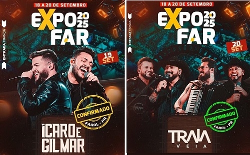 A prefeitura de Farol divulgou os primeiros shows da Expofar que será realizada de 18 a 20 de setembro. O dia 19 a cantoria ficará por conta da dupla Ícaro & Gilmar e, dia 20, o grupo Traia Véia. Um terceiro show vai ser anunciado nos próximos dias. O prefeito Oclecio Meneses também confirmou a realização de rodeio, além de um parque de diversões gratuito que incluirá uma roda-gigante de 20 metros.
