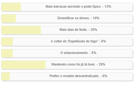 “O que devia melhorar na Festa do Carneiro no Buraco?” Enquete com esta pergunta teve votação encerrada neste domingo. Vitória da alternativa “Mantendo com foi já está bom”, com 29% dos votos. “Mais dias de festa” teve 26% e ficou em segundo. “Mais barracas servindo o prato típico” registrou 13%. O resultado completo está no quadro acima.