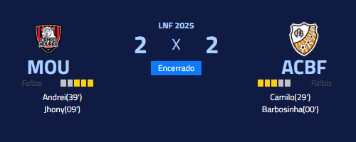 Campo Mourão e ACBF empataram em 2 a 2 neste domingo pela Liga Nacional de Futsal.