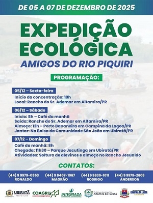 Acontece no próximo fim de semana mais uma edição da Expedição Ecológica Amigos do Rio Piquiri. A concentração começa na sexta-feira (19h) do “Rancho do Ademar”, em Altamira do Paraná. A saída será no sábado, às 8h. Aí a expedição passa por Campina da Lagoa e segue até Ubiratã. A chegada está prevista para domingo, às 11h30, no Parque Jacutinga. O evento termina com soltura de alevinos e almoço no Rancho Jesualdo.