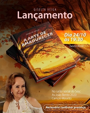 A escritora Giselta Veiga lança nesta sexta-feira (19h30) o livro “A Arte de Amadurecer – Vivendo a Melhor Idade”. Será no Sesc de Campo Mourão. “O livro é um convite à escuta, ao cuidado com os mais velhos e à valorização da experiência de vida”, destaca a autora. “Ao mesmo tempo, uma alerta para as novas gerações, muitas vezes apressadas demais para perceber que também estão envelhecendo – e talvez sem tempo de fazê-lo bem”, completa. Também haverá lançamento na Casa da Cultura de Peabiru, no próximo dia 5 (19h30).