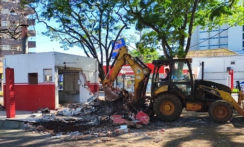 Foi demolido nesta terça-feira o quiosque que estava abandonado na praça São José, no centro de Campo Mourão. A construção original, de 1981, era de um módulo da Polícia Militar. Dez anos depois virou uma choperia (Bahamas). Nos últimos tempos estava fechado e tinha virado abrigo para moradores de rua.