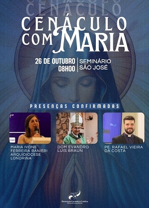 Acontece no próximo domingo, a partir das 8h, no Seminário São José, em Campo Mourão, o Cenáculo com Maria. A iniciativa é da Renovação Carismática Católica. Entre as presenças confirmadas estão o bispo d. Evandro Luis Braun, o padre Rafael Vieira da Costa e Maria Ivone Ferreira Ranieri, da arquidiocese de Londrina.