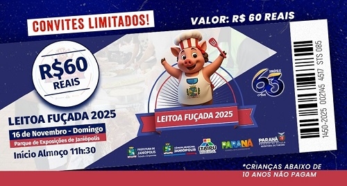 A prefeitura de Janiópolis iniciou a venda dos convites para o prato típico Leitoa Fuçada, que será servido no dia 16 de novembro. Custa R$ 60 e inclui prato personalizado e talheres. O almoço faz parte da programação de aniversário de 63 anos do município, que começa um dia antes com show da dupla João Bosco e Vinícius. No domingo (16), além do almoço, a programação inclui show com Leo & Giba (18h), e Pedro Sanches & Thiago (22h).