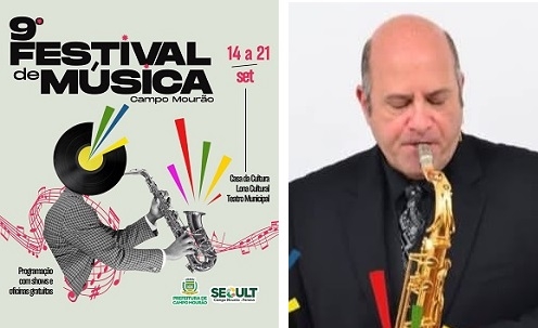 Começa no próximo domingo o 9º Festival de Música de Campo Mourão. A programação segue até o dia 21 com oficinas e shows, tudo gratuito. Uma das atrações será o multi-instrumentista Derico (aquele, do Programa do Jô!), que vai ministrar oficina de sax e flauta, junto com Jeff Sabbag, no dia 19, e fará show no dia 20 (19h), no Teatro Municipal, também em parceria com Sabbag.