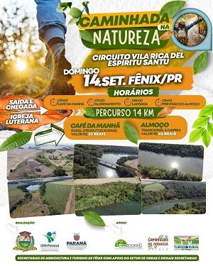 Acontece no próximo domingo (8h) a Caminhada Internacional na Natureza de Fênix. O circuito Vila Rica del Espiritu Santu tem um percurso de 14 km entre trilhas e estradas rurais. Para quem quiser tem café da manhã (R$ 20) e almoço (R$ 40). Até esta quarta-feira havia 277 pessoas inscritas. Ainda este mês estão previstas caminhadas em Mamborê (dia 21) e Campo Mourão (28).