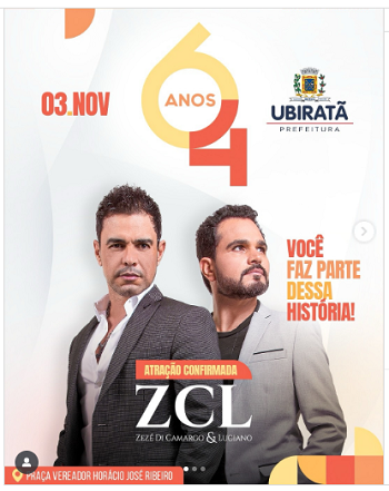 O aniversário de 64 anos de Ubiratã será comemorado com show com dupla Zezé Di Camargo & Luciano. O anúncio foi feito pelas redes sociais da prefeitura. Vai ser no dia 3 de novembro na praça Vereador Horácio José Ribeiro. E se é na praça, claro, a entrada será gratuita.