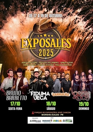 A prefeitura de Moreira Sales definiu a programação da Expo-Sales. A festa, com rodeio e shows com entrada franca, será realizada de 17 a 19 de outubro. A abertura, sexta-feira, será com a dupla Bruno & Barreto. No sábado tem Fiduma & Jeca mais a banda Garrafão. E termina, domingo, com a banda Brasil 2000. Toda a programação acontece no Parque de Exposições.