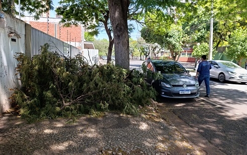 “Galhos que foram cortados pela prestadora de serviço para Copel, na av. Irmãos Pereira. Já faz cinco dias que os galhos estão atrapalhando a calçada”.