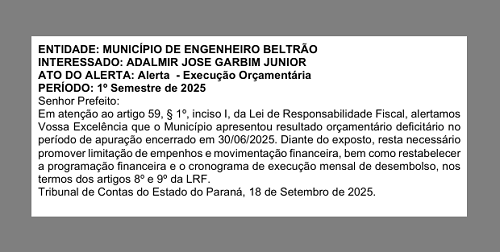 Segundo publicação desta terça-feira no Diário Eletrônico do Tribunal de Contas do Estado, o município encerrou o primeiro semestre do ano com resultado orçamentário deficitário. “Resta necessário promover limitação de empenhos e movimentação financeira, bem como restabelecer a programação financeira e o cronograma de execução mensal de desembolso”, destaca o TC.
