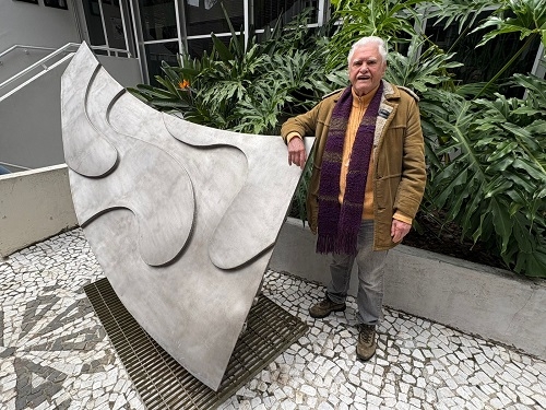 Olha aí quem se reencontrou depois de 49 anos depois! João Osório Brzezinski e sua obra. Ele é um dos autores do monumento Pró-Solo, que foi instalado em 1976 na Praça do Fórum, em Campo Mourão. O reencontro aconteceu Museu Casa Alfredo Andersen, em Curitiba, onde a obra está exposta. Trata-se da exposição “Calderari: amar, além do mar”, que presta homenagem ao artista plástico Fernando Calderari, o outro autor do monumento.