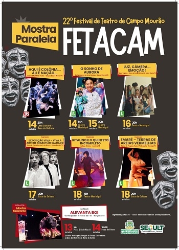 Mostra paralela - Na terça-feira começa a Mostra Paralela, com apresentações no Teatro Municipal, na Casa da Cultura e na Lona Cultural. Seis grupos participam com apresentações até sábado. Já a mostra oficial será entre os dias 21 e 25, no Teatro Municipal. Toda a programação é gratuita.