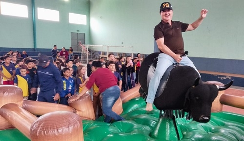 Brinquedos, brincadeiras e distribuição de pipoca e algodão doce marcaram, nesta quarta-feira, as comemorações do Dia da Criança, em Farol. As atividades foram realizadas na escola municipal Casimiro de Abreu e no CMEI Menino Jesus. O prefeito Oclécio Meneses foi acompanhar e não resistiu sem experimentar o touro mecânico. A queda, claro, foi inevitável...