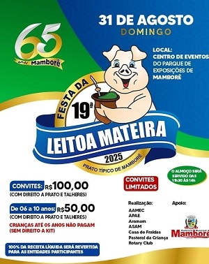 Mamborê – Acontece neste domingo a 19ª Festa da Leitoa Mateira, que deve atender cerca de 2 mil pessoas no Parque de Exposições. No próximo sábado será a vez de começar a 39ª Expomam.