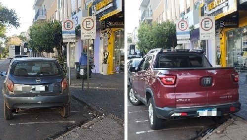 Em dois momentos, no mesmo lugar, no centro de Campo Mourão, carros estacionam em vaga para motos.