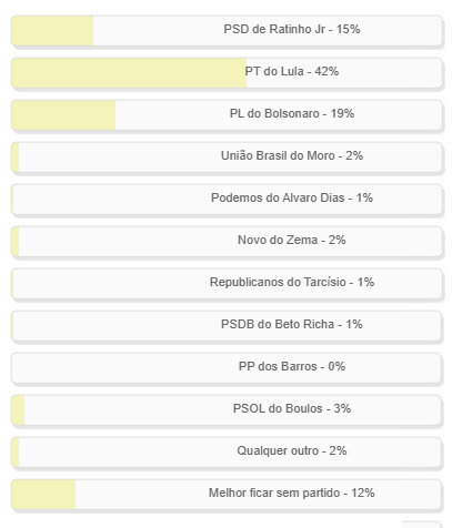 “Em que partido o ex-prefeito Tauillo Tezelli deveria se filiar?” Enquete com essa pergunta foi encerrada neste domingo. Venceu a alternativa “PT de Lula”, com 42% (pura provocação, já que Tauillo deixou Cidadania falando que o partido estava sendo “esquerda demais”). O “PL de Bolsonaro” teve 19% e o “PSD de Ratinho Jr” 15%. Para 12% é “Melhor ficar sem partido”. O resultado completo está no quadro acima. Detalhe: Alvaro Dias anunciou saída do Podemos depois que a enquete já estava no ar.