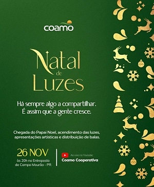O Natal de Luzes também terá transmissão ao vivo pelo canal da Coamo no Youtube.