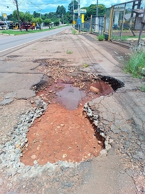 “Agora já tem novo lugar pra fazer carneiro no buraco. Tem várias dessas panelas no acostamento da av. Miguel Luiz Pereira nas imediações da Noma Motors e New Holland. Em dia de fortes chuvas, elas se enchem e não aparecem, sendo um imenso risco de acidentes”.