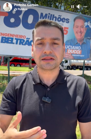 Junior Garbim, prefeito de Engenheiro Beltrão, ao esclarecer que que os R$ 80 milhões de investimentos anunciados em outdoor foram conquistados no ano passado, mas são para projetos que ainda estão sendo elaborados. O outdoor agradece o apoio dos deputados Ademar Traiano (estadual) e Luciano Ducci (federal); em vídeo postado em redes sociais.