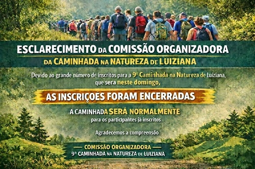 Foram encerradas as inscrições para a Caminhada Internacional na Natureza que acontece no próximo domingo em Luiziana. Motivo? Grande número de inscritos. Assim, quem se inscreveu, se inscreveu. Quem não se inscreveu, não se inscreve mais. A caminhada de Luiziana é a única que oferece café da manhã e almoço de graça aos participantes.