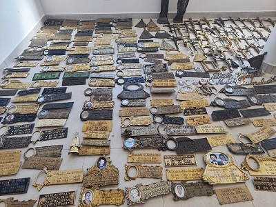São placas de bronze, crucifixos, letreiros, molduras e até duas imagens de santos.