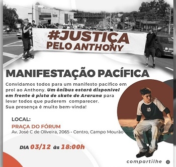 Familiares e amigos do adolescente Anthony, de 14 anos, farão manifestação por justiça nesta terça-feira (18h), na Praça do Fórum de Campo Mourão. Ele era de Araruna e morreu domingo passando em acidente perto da Vila Rural de Campo Mourão. A batida foi provocada por um carro dirigido por uma mulher de 77 anos que estava com a CNH suspensa. Ela chegou a ter prisão decretada, mas conseguiu liberdade na justiça.
