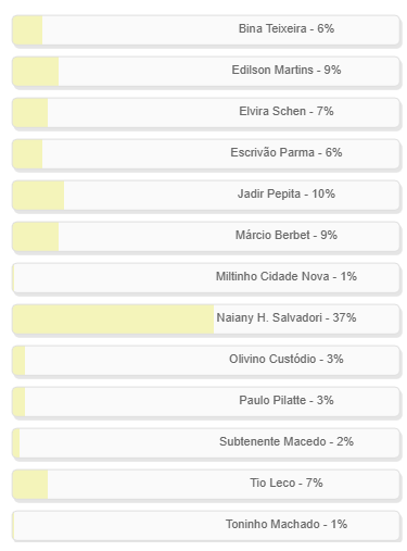 “Qual vereador (de Campo Mourão) teve melhor atuação no atual mandato?” Enquete com essa pergunta foi encerrada neste domingo. Venceu, com folga, a vereadora Naiany Hruschka Salvadori, com 37% dos votos. Justo ela, a única que não disputou a reeleição. Jadir Pepita ficou em segundo, com 10%. Edilson Martins e Márcio Berbet empataram no terceiro lugar, com 9%. O resultado completo está no quadro acima.