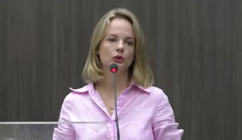 Naiany Hruschka Salvadori (PL), ao fazer discurso de despedida da Câmara de Campo Mourão, na sessão desta segunda-feira. O vereador Paulo Pilatte (PL) também se despediu. Os dois fizeram agradecimentos.
