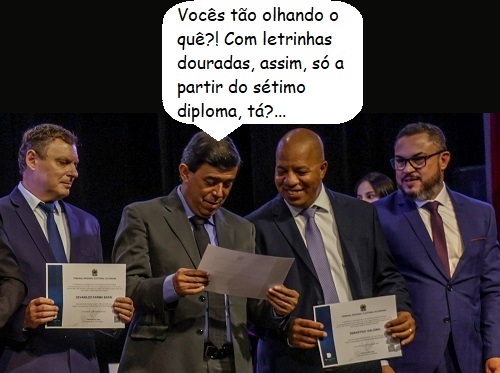 O clic é da última sexta-feira, na solenidade de diplomação dos eleitos na comarca de Campo Mourão. O vereador Sidnei Jardim, eleito para o sétimo mandato, observa o seu diploma observado por Escrivão Parma, Tião do Karatê e Márcio Berbet. Em tempo: as “letrinhas douradas” são por conta da imaginação deste Site...