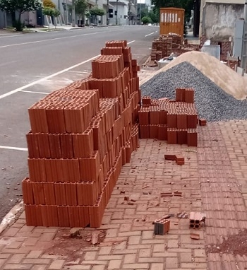 Quando os materiais de construção ocupam todo o passeio, no centro de Campo Mourão, o pedestre passa onde?