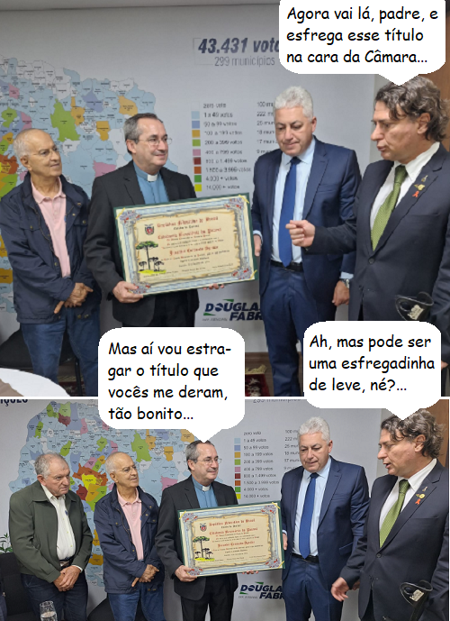 O clic é de segunda-feira, em Curitiba, quando o padre Jurandir Coronado, recebeu o título de Cidadão Benemérito do Paraná. Os deputados Douglas Fabrício e Anibelli Neto aparecem fazendo a entrega. Em março, o padre teve uma homenagem negada pela Câmara de Campo Mourão (faltaram dois votos)...