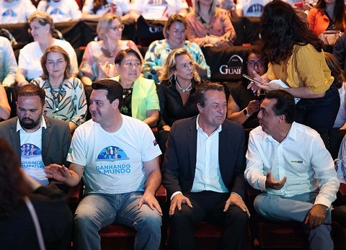 Lugar certo - Na hora da foto, no Teatro Guaíra, olha quem ficou ao lado do governador – o secretário Márcio Nunes (Turismo), que é de Campo Mourão, e o prefeito Betinho Lima, de Goioerê. Logo atrás está a chefe do Núcleo de Educação de Campo Mourão, Ivete Sakuno.