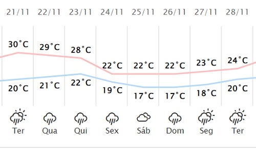 Sofrendo com o calorão em Campo Mourão? Calma. Seus problemas acabaram. Pelo menos é que diz a previsão do Simepar para os próximos oito dias. Vai chover, nem que seja um pouquinho, quase todo dia. Sem chuva, só sábado, mas fica nublado. E as temperaturas caem. A máxima vai de 30 graus nesta terça-feira para 22 graus na sexta. A mínima chega a 17 graus no fim de semana.