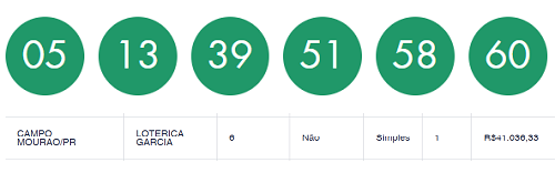 Uma aposta feita em Aracruzes/ES acertou sozinha as seis dezenas da Mega Sena sorteadas nesta terça-feira. Faturou R$ 50,2 milhões. Outras 78 apostas acertaram cinco dezenas e vão levar R$ 41 mil cada uma. Quatro delas são do Paraná, sendo uma de Campo Mourão, feita na lotérica Garcia. Ah, por um numerozinho...