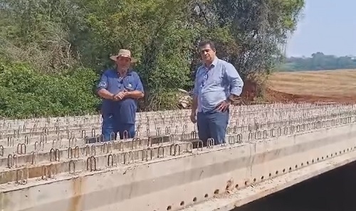 Airton Agnolin, prefeito de Nova Cantu, ao anunciar, ao lado do prefeito Vivaldo Lessa (Roncador) que a obra da ponte sobre o rio Azul, no limite dos dosi municípios, atrasou, mas está sendo retomaada e será concluída nos próximos dias; em video gravado sobre a ponte e postado nas redes sociais.