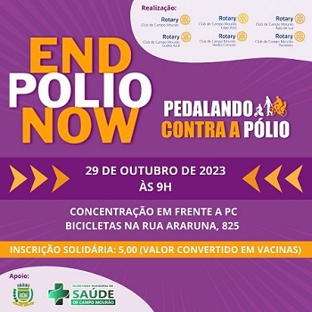 O Rotary vai realizar no próximo dia 29, em Campo Mourão, mais uma edição do passeio ciclístico Pedalando Contra a Pólio. A saída será às 9h, em frente à PC Bicicletas (rua Araruna, 825). A inscrição tem um taxa solidária de R$ 5 (o dinheiro será convertido em vacinas). Estão à frente os Rotarys Campo Mourão, Gralha Azul, Lago Azul, Verdes Campos, Raio de Luz e Fomento.