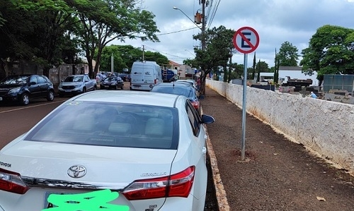 Em frente ao Cemitério Municipal a placa de proibido estacionar não foi respeitada na quarta-feira.