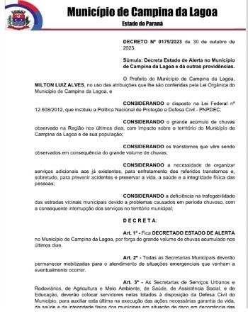 O prefeito de Campina da Lagoa, Milton Luiz Alves, decretou "estado de alerta" no município.