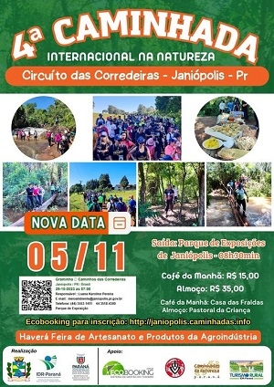 Tinha caminhada internacional na natureza marcada para este domingo em Janiópolis, certo? Certo. Mas não tem mais. O Circuito das Corredeiras foi adiado para o próximo dia 5. Motivo? Previsão de chuva. Assim, agora são quatro as caminhadas na região agendadas para novembro. Além de Janiópolis, estão marcados os circuitos de Iretama (dia 12), Quinta do Sol (19) e Luiziana (26). Sem contar que, na semana seguinte, tem a caminhada de Goioerê (3 de dezembro).