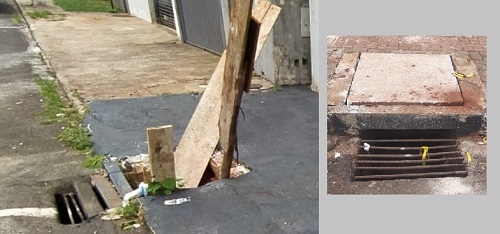 1) Olha a situação do bueiro na rua Ayrton Albuquerque, no jardim Maria Clara. Está aberto e foi "sinalizado" com tábuas.